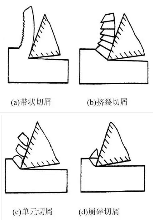 数控加工中心聚彩网产生切屑不可避免,由于工件材料不同,切削条件各异.切削过程中生成的切屑形状是多种多样的。切屑的形状主要分为带状、节状、粒状和崩碎四种类型,如下图所示。