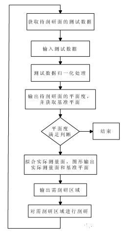 若上述已测的待刮研面的平面度不满足要求,则继续下述步骤 :在 MATLAB 软件根 据矩阵 A、矩阵 B 归一化处理后的数值拟合出待刮研面,并且输出待刮研面和待刮研面的基 准面的图形,再输出待刮研面上高于待刮研面的基准面上的需刮研区域,操作人员根据该 输出的需刮研区域再根据平板对研法采用刮研用平板对其进行刮研,刮研完毕后返回开始 获取刮研后的表面的多个点,重复上述步骤,直至平面度满足要求为止。