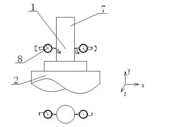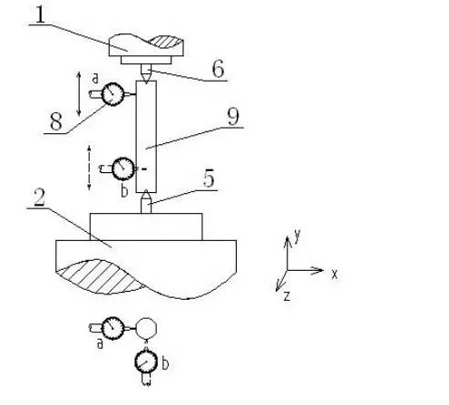 聚彩网 ②沿 Y 轴方向移动所述磨头主轴,指示器在所述第二检验棒(9)两端位置读数的差值,就是所述工件主轴与所述尾架轴回转中心在a方向的同心度误差,计为a;
