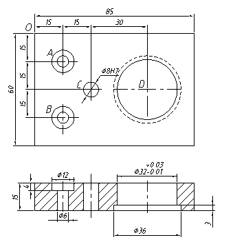 聚彩网 如图所示的零件,其上共有4个孔,两个精度要求不高的φ6/φ12的沉头孔,可以直接钻头钻穿,后采用φ12的立铣刀扩出沉孔。φ8H7的通孔要求精度较高,可以先采用φ7.8的钻头先钻穿,留0.2mm的余量进行铰削加工,保证精度。φ36的沉孔为了保证孔的同轴度和表面的垂直度可以采用背镗工艺,因此该零件安排的加工工艺过程如下:
