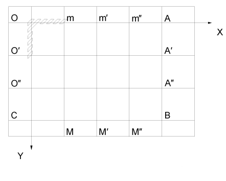 首先获取待刮研面上多个点的坐标,并将这多个点的横坐标和纵坐标分别记录在矩阵A、矩阵B中。获取这多个点时,可以采用网格法来获取。网格法获取多个点时如图2所示, 基准平面由两条直线OmX 和 OO’Y 确定,直线 OX 和 OY 最好选择成互相垂直的两条线,并分 别平行于待刮研面的轮廓边。测量时先测量 OA 和 OC 每条线的轮廓,再测量 O’A’、O’’A’’ 和 CB 纵向线的轮廓,以便覆盖整个待刮研面,测量完毕后可沿 mM、m’M 等作追加测量,以进 一步证实上述测量。当待刮研面的宽度与其长度不相称时,可同时沿对角线测量,即所谓的 交叉检查。测量时可采用精密水平仪进行测量。
