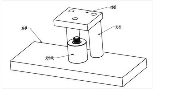 聚彩网 设计要点:上图为冲孔工装的常用结构。底板作用为方便固定在冲床的工作台;定位块作用为固定产品,具体结构按产品的实际情况而设计,中心点围绕能方便安全的取放产品;挡板作用在方便产品从冲刀上脱离;支柱起固定挡板的作用。上述几个部位的装配位置和尺寸可按产品的实际情况设计。