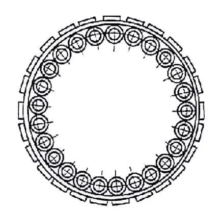 此刀库结构简单,应用较多。如上图所示,由于刀库呈环形排列,空间利用率低,因此出现了刀具在盘中进行双环和多环排列,以增加空间的利用率的设计。但这样一来,刀库的外径较大,转动惯量也很大,选刀时间也较长。因此,盘式刀库一般适用于刀具容量较小的刀库。