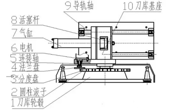 刀库刀盘的横向移动是使用气压传动机构来实现的。如图2.2所示,机床箱体上安装有两个平行的导杆9。刀库刀盘安装在刀盘基座10上,刀盘基座10安装在这两个导杆9上并可以沿着导杆9作横向移动。同时,气缸7固定安装在机床箱体上,刀盘基座10与气缸7中的柱塞8固定连接。通过柱塞8的横向移动来实现刀盘基座10的横向移动,从而带动刀盘在初始位置和换刀位置之间的切换运动。气缸7上装有两个磁环开关,当左端磁环开关亮时,气缸处于原始状态;当右端磁环开关亮时,气缸处于推出信号状态,这时柱塞会右移,刀盘会移动到换刀位置。